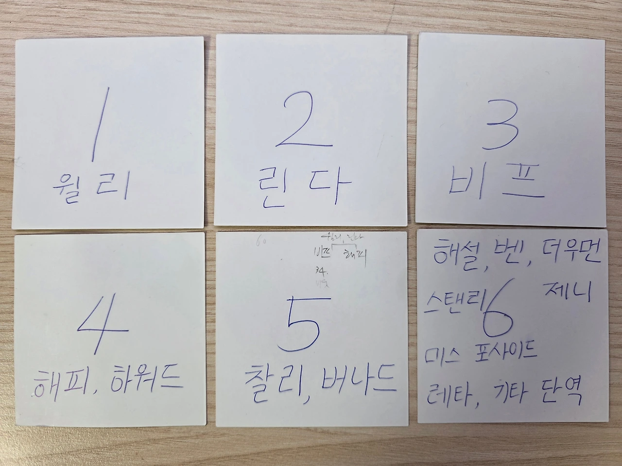 머릿속으로 수없이 시뮬레이션했던 대로 가볍게 시작 멘트를 건네고, 다 함께 입을 풀기 위해 혀 체조를 했다. 가장 떨리는 순서인 배역 정하기 시간. 나는 단골 카페에서 모아두었던 작은 원두 설명서 뒷면에 번호와 배역을 적어두었다. 향긋한 커피 향이 배어 있을 것 같은 그 종이들을 뒤집어 놓고, 다 함께 가위바위보를 해 이긴 순서대로 제비를 뽑았다.