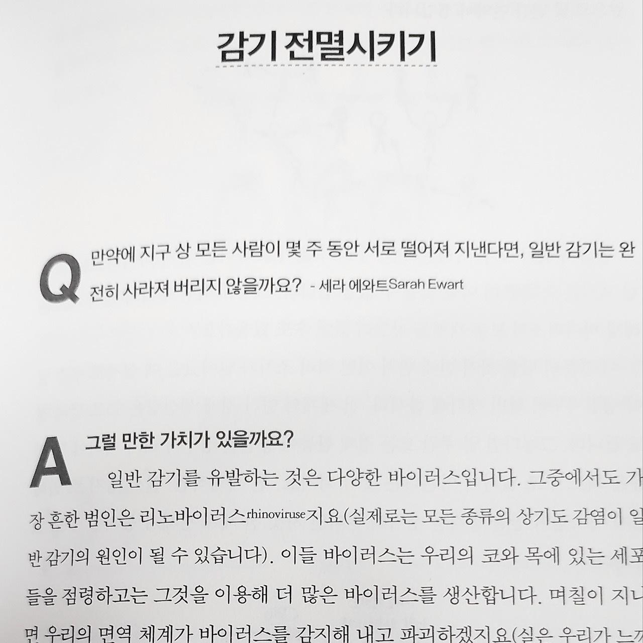 질문) 만약에 지구 상의 모든 사람이 몇 주 동안 서로 떨어져 지낸다면, 일반 감기는 완전히 사라져 버리지 않을까요?