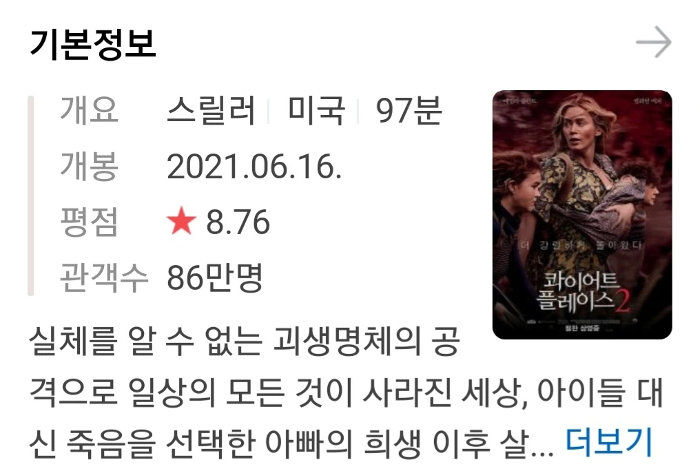 소리가 외계 생명체에게는 치명적이라는 스토리는 이미 어느 영화(제목이 기억 안 나요ㅠ)에서 나온 얘기라서 별로 특별할 건 없었습니다. 1편에서부터 계속 딸의 보청기를 소재로 다루고 있었거든요. 다만 소리 없이 스토리를 끌고 가고, 게다가 청각장애를 가진 큰딸이 문제를 해결해 나가는 과정에서 관객이 그들과 호흡을 같이 한다는 측면에서 이 영화는 충분히 감독에게 즐겁게 놀아나도 좋을 영화라고 생각합니다. 신선하고 조마조마하고, 여러 희생을 통한 인류애로 살아남은 끈질긴 가족의 영화로 기억할 것 같습니다. 이제 남은 생존자들이 남은 외계 생명체를 어떻게 무찌를지 기대되며 3탄은 조금 더 잔인하고 신박했으면 하는 개인적인 취향을 밝힙니다.