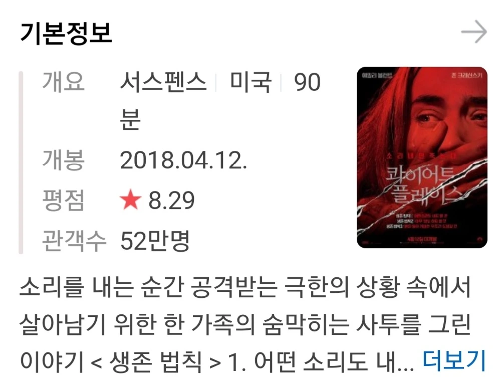 몇 달 전, 존경하는 그레이프 작가님의 영화 ‘콰이어트 플레이스’ 리뷰를 읽으며 늘 따뜻하게 영화를 품으시는 그가 이 포스터만 봐도 극강의 공포스러운 영화를 '가족애를 다룬 따듯한 영화'라고 했는지 궁금해졌었습니다. 과연 나도 작가님과 같은 시선으로 영화를 감상할 수 있을까 하는 마음으로 한낮부터 영화를 결재하고 거실에 자리를 잡았습니다. 하필 그날은 제가 집안의 모든 소리가 소음으로 들릴만큼 유난히 까칠했던 날이었습니다. 영화가 시작되고 연이어 2편까지 꼬박 앉아서 숨죽이며 감상했습니다. 이 영화는 참 화면에서 눈을 떼지 못하게 하는 묘한 매력이 있는 영화입니다. 그도 그럴 것이 사운드가 거의 없거등요.