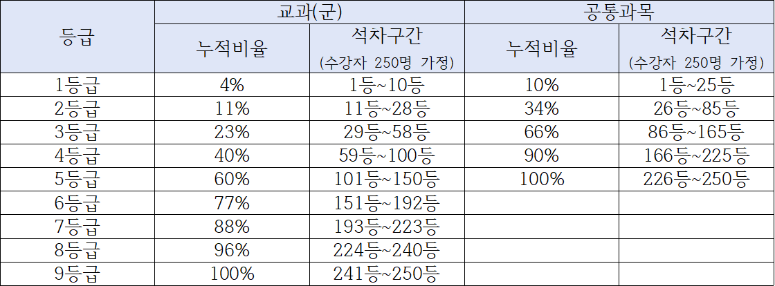 절대평가: 사회·과학 융합선택, 체육‧예술, 과학탐구실험, 교양 과목