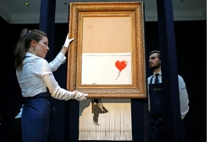 영국 런던 소더비 경매의 현대미술 판매전에 뱅크시의 회화 작품 ‘풍선과 소녀’(Girl With Balloon)이 출품됐습니다. 그림 가격은 당초 20만∼30만 파운드(2억 7000만∼4억 4000만원)로 추정됐는데, 수수료를 포함해 104만 2000파운드(15억 4000만원)에 낙찰됐습니다. 재미있는 것은 진행자가 낙찰을 알리는 의미의 봉을 몇 차례 내려치고 나서 얼마 되지 않아 갑자기 경고음 비슷한 것이 울리더니 뱅크시의 그림이 액자 밑을 통과하면서 가늘고 긴 조각들로 찢어졌습니다. 참석자들은 믿기지 않는 광경에 재빨리 사진으로 찍기 시작했고, 경매사 직원들은 반쯤 분쇄된 뱅크시의 작품을 벽에서 떼어내 어디론가 가져가 버렸습니다. 뱅크시는 사건 하루 뒤 자신의 인스타그램 계정에 액자에 분쇄기를 설치하는 모습과 낙찰 직후 그림이 잘려나가는 영상을 올리며 사건이 본인의 소행임을 인정했습니다. 이 사건은 전세계적으로 뱅크시를 유명하게 만드는데 일조를 한 사건 중 하나가 됩니다.