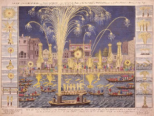 1749년 5월 15일 월요일에 템스 강과 리치먼드 공작의 화이트홀에서 열린 불꽃놀이와 조명 광경
