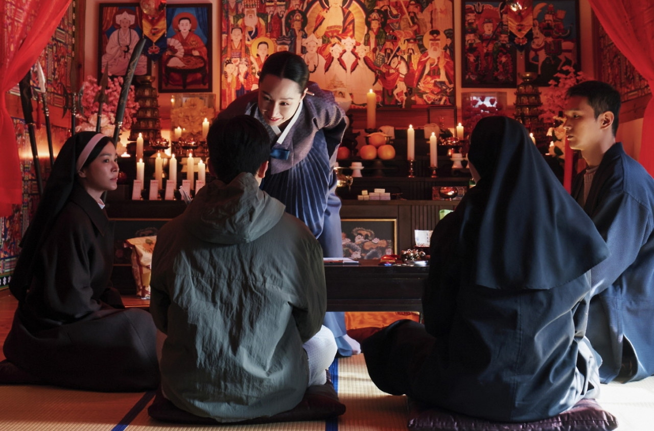 검은 사제들과 마찬가지로 여러 종교의 결합을 보여줍니다. 무교와 가톨릭의 조합을 보여주며 점술로 분류되는 타로까지 등장했죠. 무당이 굿을 하고, 식을 거행하며 순차적으로 종교식이 거행됐던 전작과 달리, 굿과 기도를 동시에 하는 장면이 등장합니다.