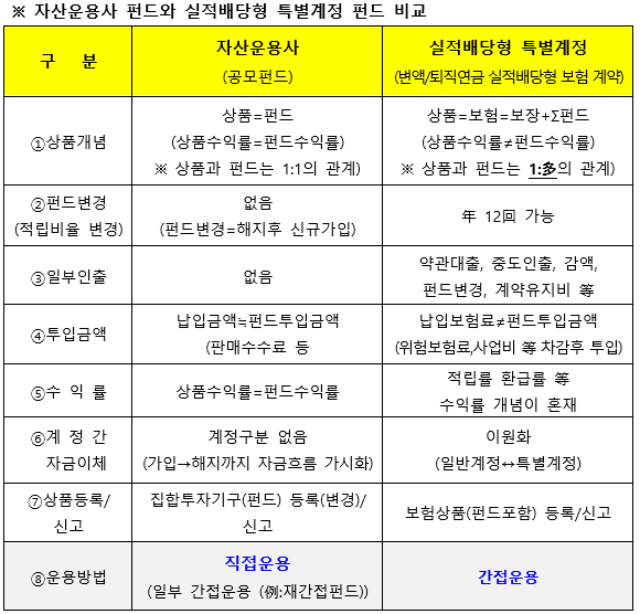 그럼 여기서 자산운용사에서 운용하는 공모펀드와 실적배당형 특별계정에서 운용하는 변액보험 또는 퇴직연금 실적배당형 보험계약의 펀드가 어떻게 다른 지에 대해 표로 정리해서 설명드리겠습니다. 아래 표는 전반적인 차이내용을 항목별로 비교해 보았습니다만, 구체적인 내용들은 차차 설명드리도록 하고 여기서는 직접운용과 간접운용에 대해서만 중점적으로 살펴보겠습니다.