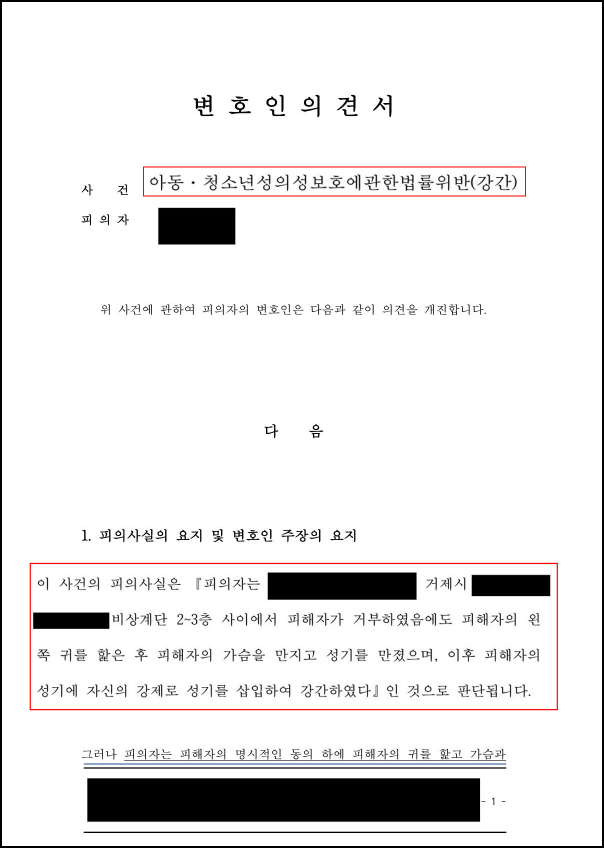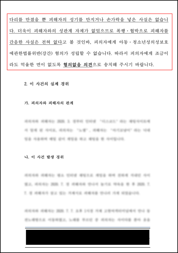 유일한 증거는 피해자 측의 법정 진술뿐이었지만, 수사 과정을 비롯한 법정 진술에서도 구체적으로 진술하지 않았다는 점을 들어 범행 혐의를 입증해 내기에 부족하므로 무죄라는 주장을 이어갔습니다.