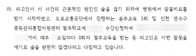 이러한 점들을 택시이용내역과 대리운전 이용내역으로 입증하였고, 자신의 잘못을 진심으로 반성하고 있습니다.