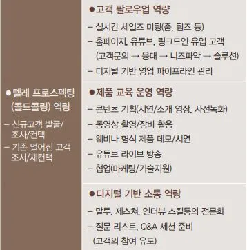 둘째, 디지털 기술의 활용역량을 강화해야 한다. 디지털 디바이드(digital divide : 디지털 지식 및 활용기술의 격차)가 발생되는 지점이기도 한데 기존 오프라인에서 고객을 만나 제품을 시연하고, 가격 협상을 했던 모든 영업활동을 VOD(Video On Demand : 맞춤 영상 정보서비스)나 온라인 라이브 방송 형태로 제작해 고객과 소통할 수 있어야 함을 의미한다. 기업에 따라 제작환경의 편차는 크겠지만 승부처는 콘텐츠의 질에 달려있다. 콘텐츠의 질은 장비 인프라와 같은 기술적인 면도 중요하겠지만 결국 영업대표의 기획ᆞ편집ᆞ소통 역량에 좌우된다고 볼 수 있다. 어떻게 보면 디지털 환경에서 김태호 PD와 유재석씨의 역량을 두루 겸비한 영업대표가 필요하게 된 것이다. 또한 디지로그 셀링의 성패가 철저한 사전 준비에 달려 있다는 점도 간과해선 안된다. 즉, 아래의 표에서 제시한 다양한 디지로그 활동들이 원활하게 운영되기 위해선 완성도 높은 시나리오는 물론 유관부서와의 협조가 필수적이기 때문이다.