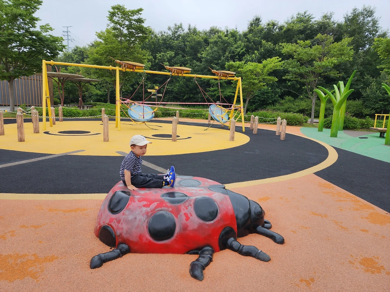 어른만 입장료를 내고 유아차를 타고 들어갔다. 전기차가 다음코스까지 무료로 이동시켜 주었다. 물론 멀지 않은 거리라 여기저기 구경하며 걸어도 되겠지만 전기차를 타보는 것도 재미있을 것 같아 탑승하였다. 역시 색다른 차를 타니 신나고 즐거워 한다. 뛰뛰빵빵 노래가 절로 나온다.조금 걷다 보니 하다람 놀이터가 있었다. 숲 놀이터, 꼬마친구 놀이터, 물 놀이터등 다양한 테마로 구성된 아이들 전용놀이터이다. 준이가 좋아하는 무당벌레를 보자 반가워하며 올라가 본다. 역시 아이들에겐 놀이터가 최고다.
