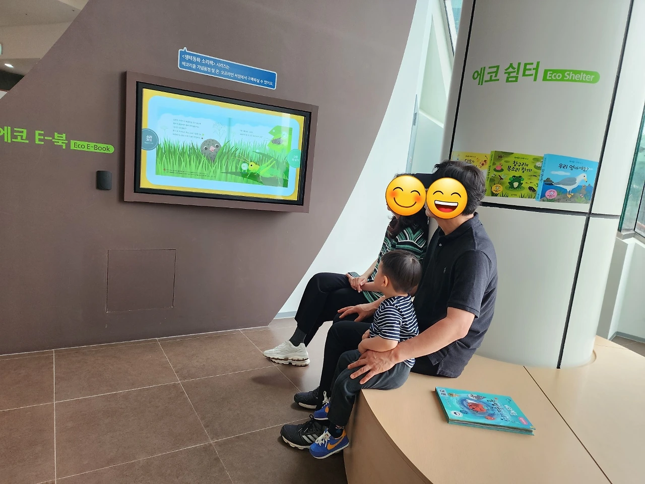 멀리 하얀 건물이 보여 가보니 오늘의 주인공 에코리움이 있다. 중간에 대나무 숲길과 사슴생태원이 있었으나 실외라 혹여 더울까 봐 그냥 지나쳤다. 준이가 사슴을 못 보고 온 것이 못내 아쉬워 기회가 된다면 가을쯤 다시 한번 와봐야겠다. 입구에 들어서니 박물관이나 전시장 같은 느낌도 들었다. 천장에는 커다란 곤충들의 구조물로 입장객의 시선을 끌며 환영하여 준다. 중앙에는 생태 관련 도서가 있는 어린이 생태글방이라는 도서관이 있다. 준이의 발걸음이 멈췄다. 책을 좋아하는 준이가 오로지 얌전하게 주의집중하는 시간이다. 에코-E북 영상도 몰입감 있게 시청하였다. 준이는 가끔 핸드폰으로 동화를 보기는 하지만 아직 티브이를 보지 않았다. 물론 준이가 오면 우리도 티브이는 보지 않는다.