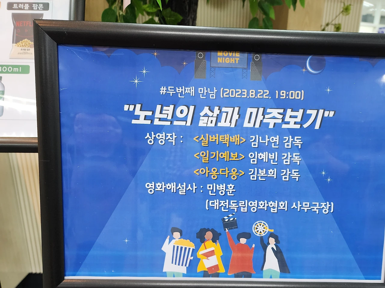 나의 노년을 생각해 보게 하는 하루였다. 세편의 독립영화가. 신중년센터에서 주관하는 씨네토크라는 프로그램에 참여했다. 신중년은 중년도 아니고 노년이라고 하기엔 다소 젊은 퇴직자들이 여기에 속한다.(50~65세)나 같은 사람. 얼마 전 나는 이곳에서 운영하는 글쓰기 연수에 참여한 적이 있었다. 오늘 "씨네토크"라는 프로그램이 개최된다기에 호기심으로 참여해 보았다. 이 프로그램이 무엇인지, 어떤 식으로 운영되는지 궁금하기도 하고, 무엇보다 뭔가 던져주는 메시지가 있을 것만 같았다.