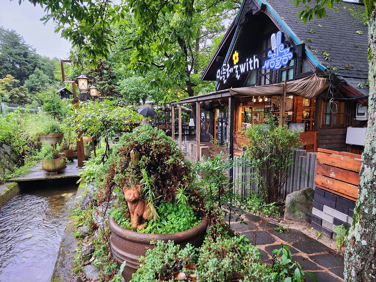생선구이는 고등어, 바닥대구, 전어등 제철생선과 돌솥밥, 게장류 반찬으로 이루어진 한식 식당으로 깔끔하다. 따뜻한 돌솥밥 누룽지를 먹고 나니 배부름과 함께 여유가 생겼다. 나이가 먹긴 먹었나 보다. 출렁다리의 긴장감이 이제야 해소되다니.잠시 후 손님들이 모이기 시작했다. 이왕 나섰으니 보고, 먹고 다음 행보인 마실 것을 향해 장소를 이동했다. 브런치가 내게 맡겨준 소임이 있기에. 최소한 거창의 맛과 멋을 따라 나그네 길을 떠나 왔다면 들러야 한다. 도착한 곳은 넓고 예쁜 허브카페다. 월성계곡을 따라 커다란 정원에 아기자기한 소품과 어우러진 꽃, 연못, 허브정원 등 볼거리가 많은 야외카페다. 한 바퀴를 돌며 구경하는데 제법 시간이 걸렸다. 커피의 맛 끝에 허브향이 감도는 허브커피와 함께 흐르는 계곡물을 보며 물멍으로 여유를 부려본다. 약하게 오는 비가 또다시 가을을 재촉한다. 제법 선선하다.