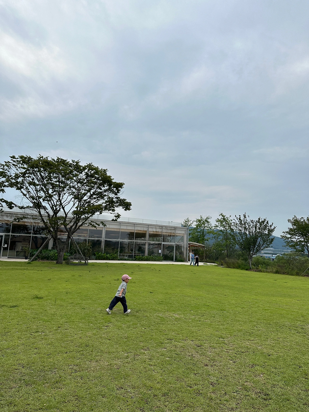 진천이라는 지역이 그리 넓지 않아서 이동하는데 시간이 많이 소요되지 않았다. 식물원카페이자 넓은 잔디밭과 건축물들이 있는 곳이며 이곳 역시 도서관이 있는 북카페이다. 딸과 사위가 디자인을 전공한 사람들이고 요즘 우리도 건축이나 주택에 관심이 많기에 안성맞춤인 카페였다. 무엇보다 준이가 놀만한 공간이 될까 싶어 만나기 전에 사전답사를 하고 간 곳이었다. 이 정도의 카페면 가족 모두의 욕구를 채워줄 수 있을 것 같았다.이곳도 세대통합이 가능한 곳이다.오늘의 준이와의 만남에서는 정원이 있어야 하고, 뛰어놀 수 있는 잔디밭이 있어야 하고, 볼 수 있는 책이 있어야 한다는 전제조건이 있었다. 거기에 덤으로 남편이나 사위가 관심 있어하는 건축디자인이 함께 있었다. 뤁스퀘어라는 카페에는.