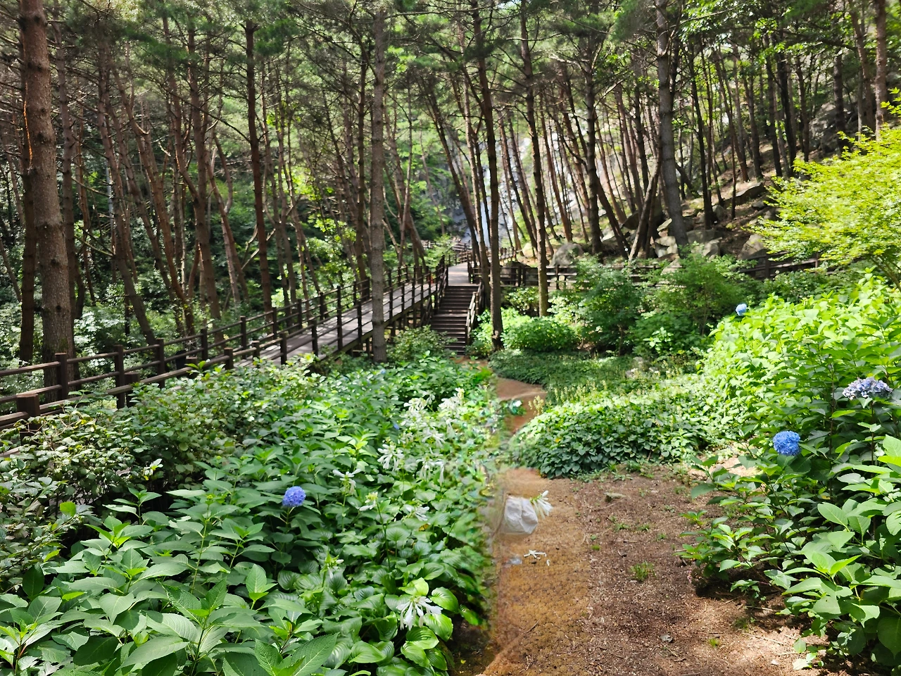 농원의 꽃들에게 안녕을 전하며 한 바퀴 행진을 하였으니 나를 위한 행진에도 팡파르를 울려야겠다. 지난번 약간의 비가 오고 무섭기도 하여 완주하지 못한 출렁다리를 건너야 할 것 같았다. 왠지 중간에서 돌아온 기분이 아니 간만 못한 것처럼 뭔가 마음 한편에서 불편함으로 남아있었다. 그 어떤 것도 완결하지 못하는 인생을 살 것만 같은 쓸데없는 기우인지도 모른다. 이번엔 또 다른 반대쪽에 있는 Y자형 출렁다리로 가서 그 기분을 만회해 보리라.
