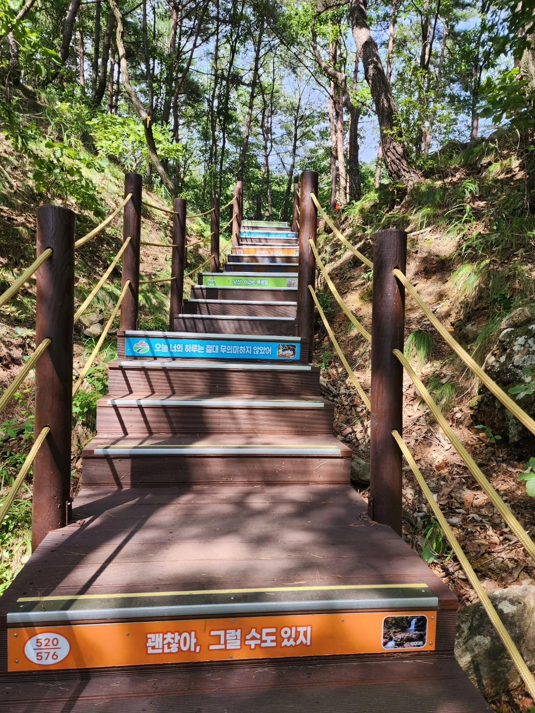 Y자형 출렁다리까지 올라가는 576개의 계단마다 삶의 지침이 되는 문구들이 힘내라고 용기를 주었다. 물론 수승대 올라가는 쪽 계단에도 있었다. 거창군의 관광도시다운 면모이자 작은 배려라는 생각이 들었다. 한 계단 오를 때마다 힘들고 지친 몸을 좋은 문장을 읽으므로 빠르게 의식전환하여 긍정아이콘으로 삶의 모드를 바꾸어 놓았다. 여행하면서 주변의 자연을 보고 배우기도 하지만 스치는 차창가의 글귀 하나에서도 인생을 배운다. 곳곳에는 삶의 스승들이 참 많다. 그동안은 왜 그냥 스치고 지나갔을까? 왜배우고 느끼려 하지 않았을까?