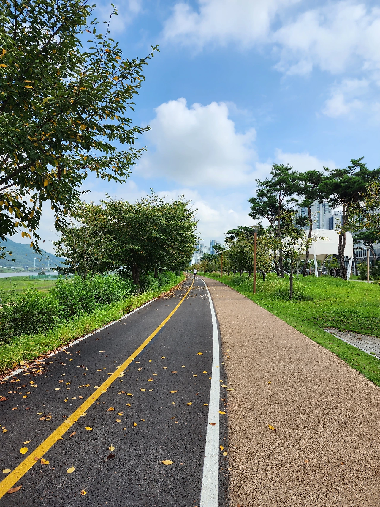 상쾌하다. 도로옆 가장자리에는 벌써 낙엽이 나뒹군다. 아무리 더워도 어김없이 세월은 가고 계절은 변하고 있다. 아침시간에 산책하는 사람이 많다. 주로 밤산책을 많이 한 탓에 아침산책 풍경은 다소 생소하기도 하다. 그 풍경 또한 다채롭다. 반려견과 같이 나온 사람. 아픈 아내를 부축하며 걷는 노부부. 옷을 흠뻑 젖은 채로 달리는 런닝맨. 핸드폰을 보며 느리게 걷는 젊은 여자분등 다양한 풍경 속에 보행자 도로옆 자전거 도로를 달렸다.