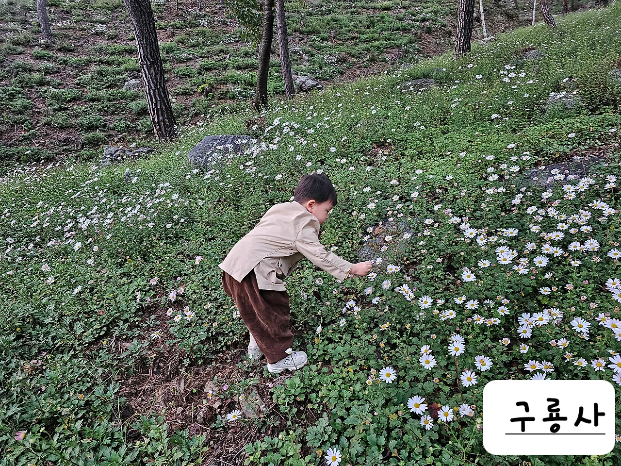 지난주에 준이와 함께 구절초 군락지로 유명한 공주의 구룡사에 갔더니 완전히 만개하지 않았다. 절 뒤의 산책로에는 하얀 구절초가 꽃망울을 머금은 채 일부만 피어 있었다. 그래도 나름 근사했다. 준이는 손으로 만져보고 향기도 맡아본다. 바람에 일렁이며 무리 지어 움직이는 구절초는 언뜻 깔깔대며 웃는 준이의 얼굴 같기도 하고, 청초한 가을 여인 같기도 했다. 산속에서 꽃과 놀고 있는 아이가 한 폭의 그림 같았다. 그날만큼은 자주 가던 키즈카페나 백화점 놀이공간에서 느끼던 번잡함을 탈피하여 조용한 자연에서 머무르게 해주고 싶었다.