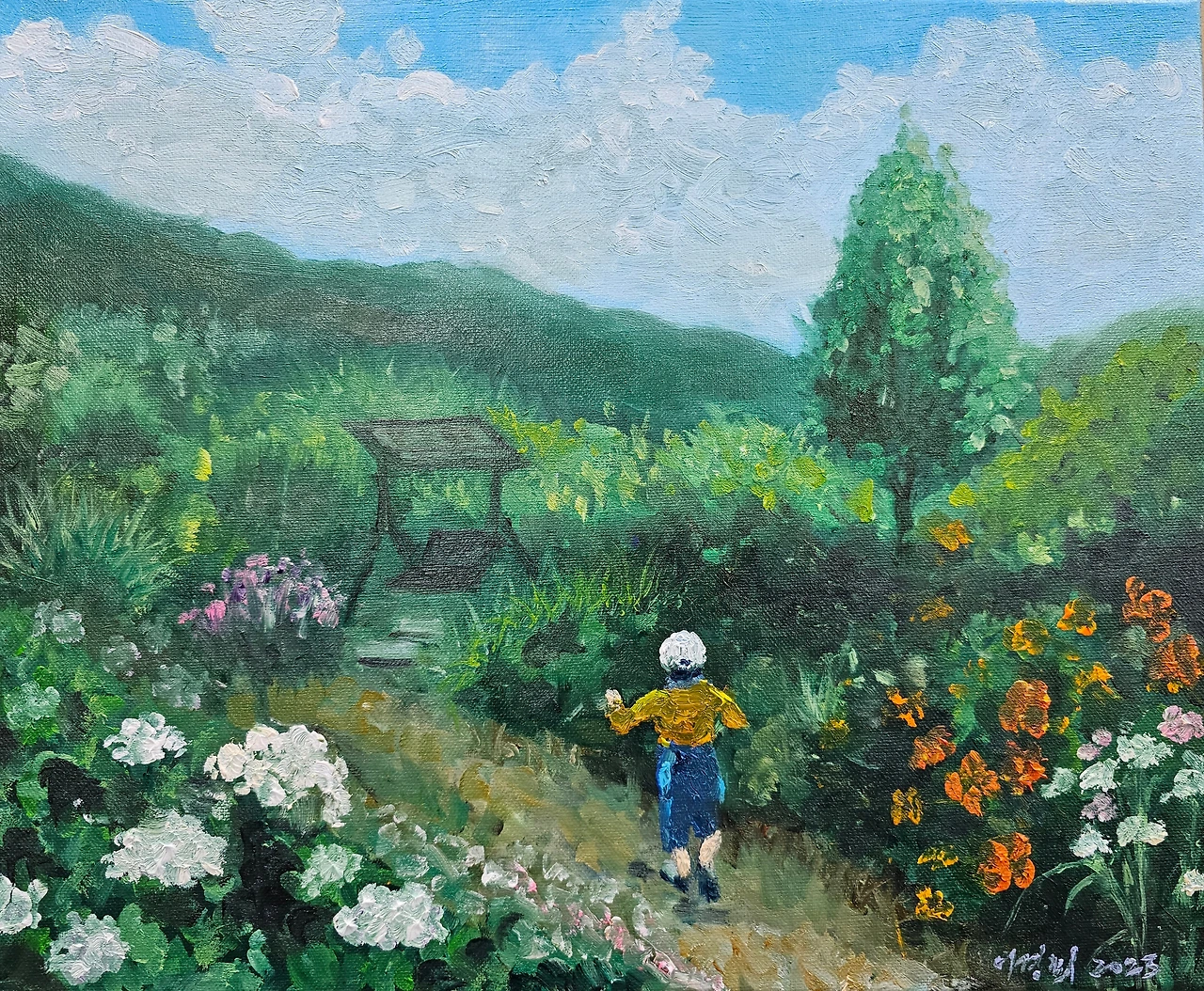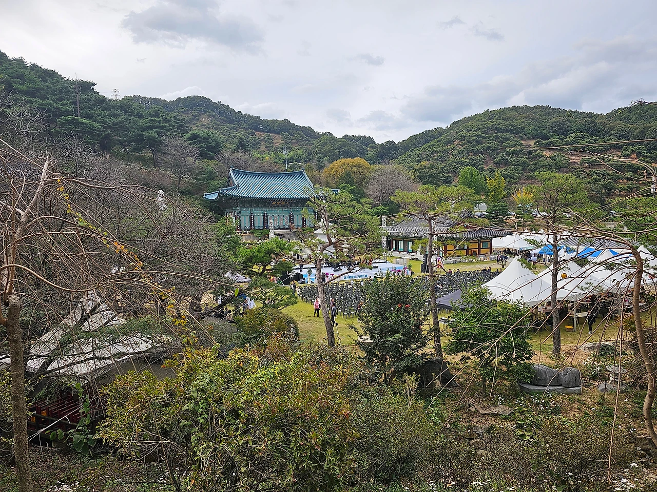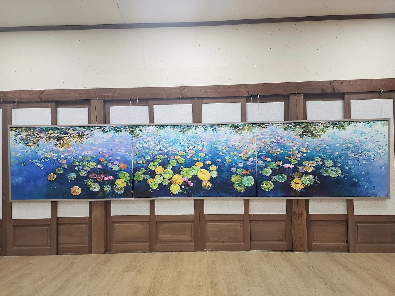 지금은 저녁에 개최될 음악회 리허설 중이었다. 오케스트라가 웅장한 불교음악을 연주하고 있다. 파란 가을하늘 아래 아늑한 산사와 자연, 맑은 공기 속에 스며든 풋풋한 꽃향기만으로도 정신이 맑아지는 곳이다. 여기에 음악이 더해짐은 평온함 그 자체였다. 한 바퀴 돌다보니 어느 화가의 초대미술전이 열리고 있었다. 세 폭으로 이루어진 수련화가 너무 아름다웠다. 최근 그림을 처음 접하며 배우고 있는 우리에겐 미술 전시관은 관심이 많이 가는 곳이었다. 10년 간만 열심히 배워 바다나무 정원에서 우리들만의 전시회를 열고 싶은 마음에.