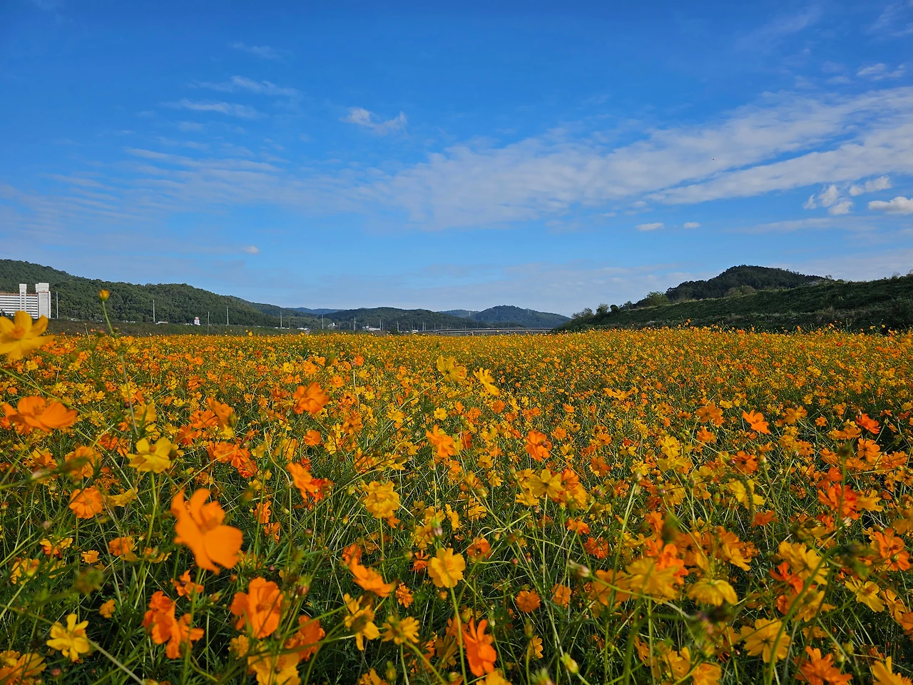 일정상 산사음악회를 못 보고 오는 것에 아쉬움이 남았다. 돌아오는 길에 한 무리 지어 흐드러지게 피어있는 코스모스 군락지가 보였다. 연분홍 코스모스와 황화코스모스가 넓은 들녘에 하늘과 맞닿아 있다. 아름다운 유혹에 우리는 아무리 바빠도 발길을 멈출 수밖에 없었다. 가족들, 연인들, 반려견들과 함께 나온 사람들로 북적였다. 이렇게 넓은 들녘에 피어있는 코스모스는 처음 본 것 같다. 역시 무엇이든지 한 곳에 무리 지어 있어야 아름답다. 코스모스도 들국화도. 때 묻지 않은 순수함으로 예나 지금이나 가을 들판을 지켜내고 있는 꽃들이 무척이나 정겨웠다.
