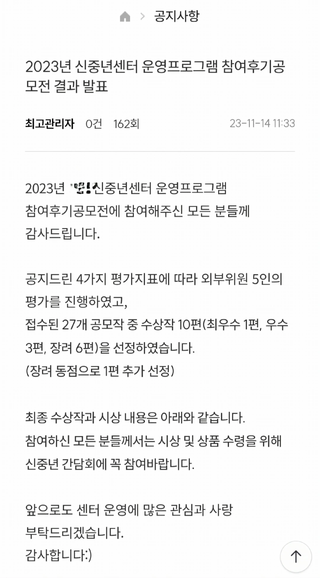 앞으로 인생 2막의 새로운 포문을 신중년센터와 함께 열어가길 바라며, 보다 다양한 프로그램으로 많은 사람들이 수혜 받기를 희망한다. 감사함을 전한다.