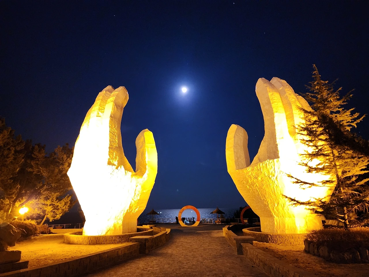 배가 부르고 나니 다리도 잠시 쉬고 싶다고 한다. 향기 그윽한 커피가 나를 유혹했다. 천국의 계단이 있는 썬크루즈 카페를 찾아갔다. 커피를 마시러 가는데 입장료를 받기에 의아해했더니 나중에 커피값에서 입장료만큼 감해 주었다. 포토존으로 유명한 천국의 계단은 정해진 시간이 지나 폐쇄하였고 조각공원에는 여러 가지 조형물이 설치되어 바다를 배경 삼아 볼거리를 제공해 주었다. 잠시 산책하고 바다를 바라보며 조금씩 앉은 의자가 돌아가는 배안에서 커피를 마셨다. 다소 모양새는 근사해 보였지만 유일한 내륙도시에서 살다 온터라 남편은 어지럽다고 이내 가자고 한다. 하긴 나도 약간 멀미가 나는 듯했으니 둘 다 촌스럽기는 마찬가지다.
