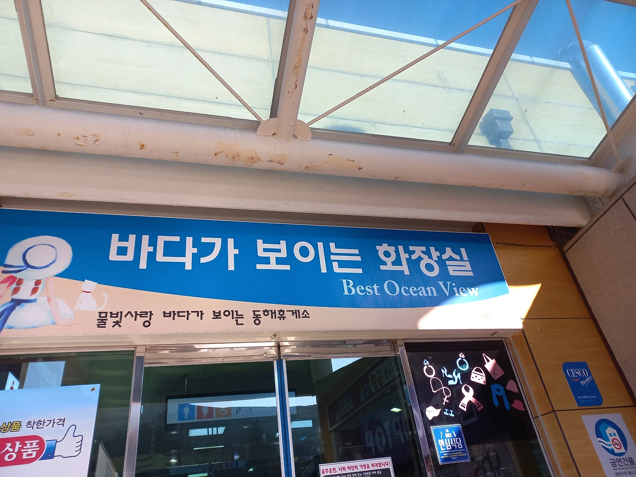 여유 있게 아침을 먹고 동해로 출발했다. 네비는 3시간이 소요된다고 가리켰다. 그래, 급할 것 없으니 보고, 맛보고, 즐기며 여유 있게 다녀오자. 수학여행을 가는 아이들처럼 다소 들뜬 기분이었다. 한참을 가다가 볼일도 볼 겸 커피가 생각나서 동해휴게소에 들렀다. 바다가 보이는 화장실이라는 문구가 보였다. 들어가 보니 이름 그대로 낭만이었다. 설마 볼일을 보며 바다를 볼 줄이야... 뱃속도, 눈도 시원해졌다. 그런데 벽에 써놓은 문구 또한 명언이었다.(다는 기억나지 않지만.)