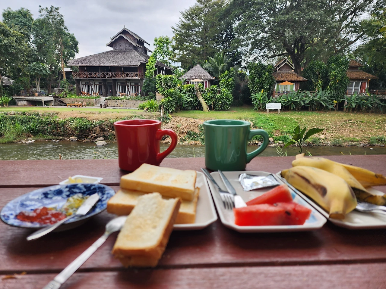 닭 우는소리와 새들의 지저귀는 소리로 빠이에서의 아침을 맞는다. 세상이 조용하다. 시내에서 대나무 다리를 하나 건너왔을 뿐인데 이곳은 또 다른 세상이다. 한유하게 밭에서 풀을 뜯고 있는 소들의 풍경이 정겹다. 숲 속에 있는 방갈로라 그런지 아침공기도 상쾌하다. 숙소에서 아침을 주기에 여유롭게 흐르는 강물을 보며 간단한 식사를 즐겼다. 참으로 평화롭다. 설악산에 와보셨다는 주인내외분의 친절도 유독 정겹고 반갑다. 아름다운 산과 함께 한국사람들에 대해 좋은 기억을 가지고 있는 듯하다.