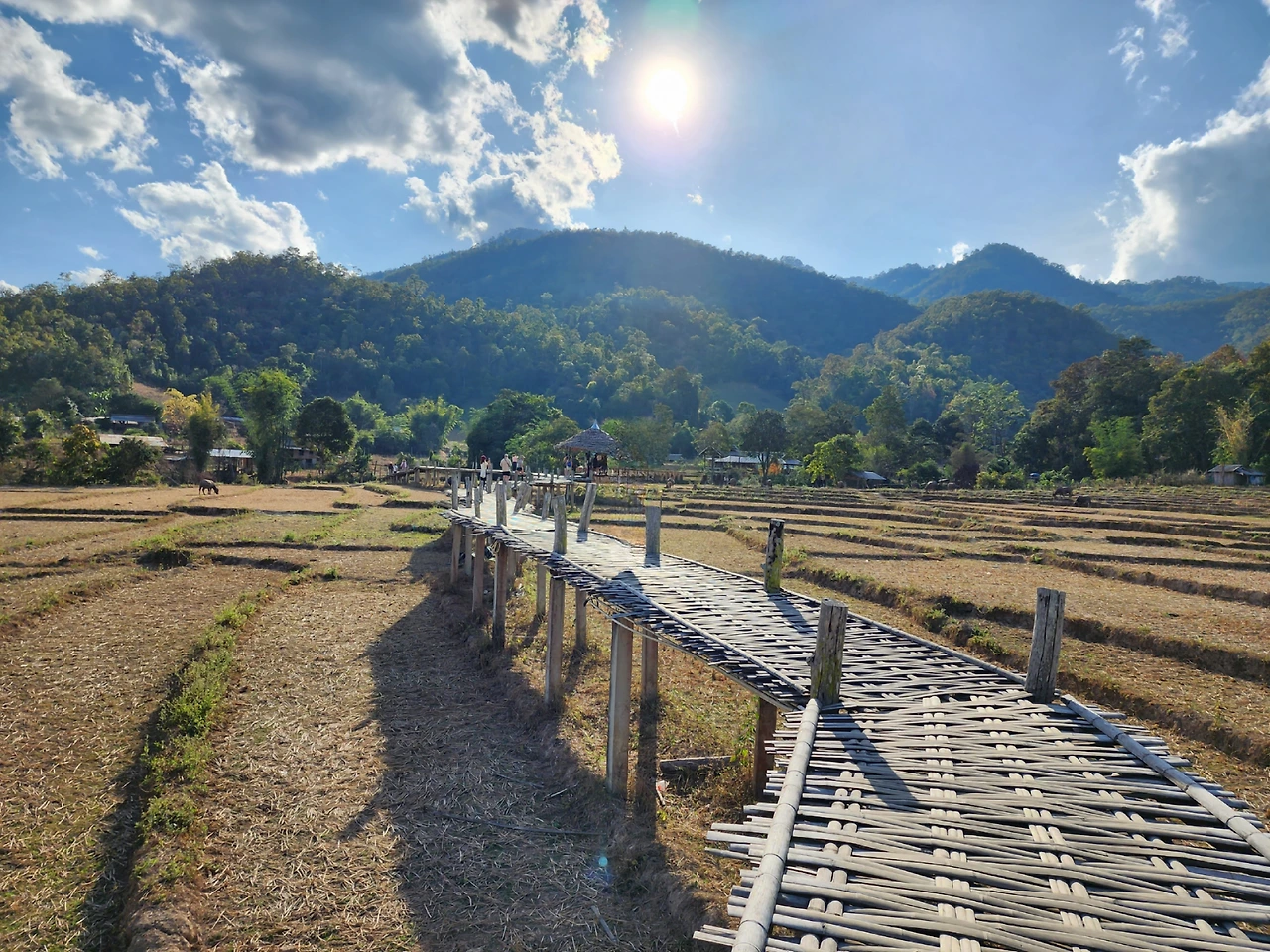 다음 관광지는 "Bamboo Bridge"이다 개인적으로는 자연을 좋아하는 터라 제일 좋았다. 시골마을을 대나무로 다리를 길게 만들어 산책하는 코스이다. 주변에는 색깔 있는 벼와 소등 목가적인 자연풍경들이 조성되어 아름다웠다. 우리나라 데크길과 비슷한 느낌이지만 마을을 가로지르는 산책로라 더 친근감 있다. 잘 보존된 자연환경에서 여유 있게 걸으며 자연을 감상할 수 있어서 좋았다. 역시 인위적인 관광지보다는 자연 그대로가 좋다. 끝없는 대나무 다리가 하늘까지 닿을 듯 산길로 이어져 한 시간 이상 자연 속에서 힐링할 수 있었다. 참으로 평온하다는 느낌이다.