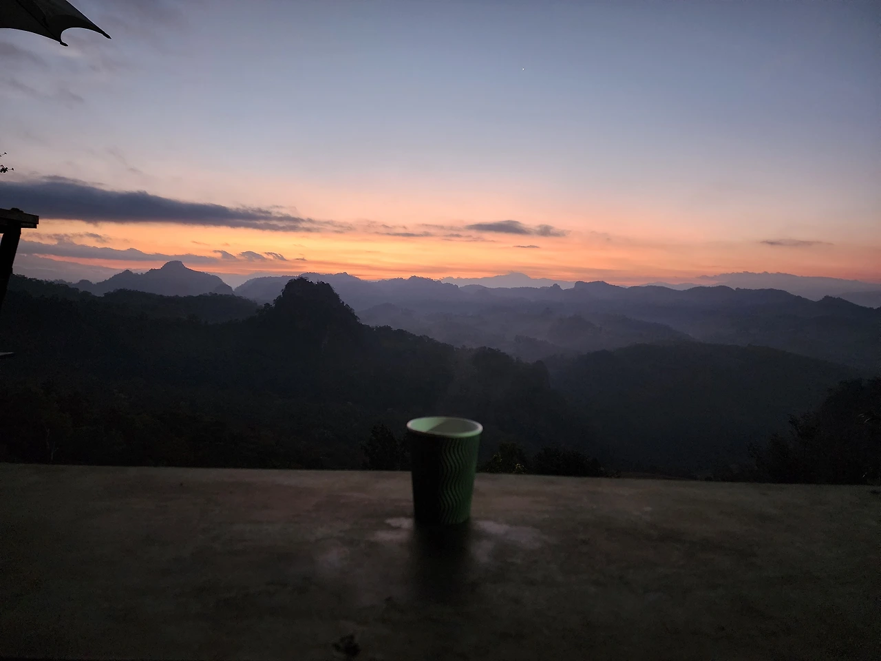 이렇게 여행사의 도움으로 하루종일 빠이를 관광하고 돌아오면서 다음날 아침 일출을 보러 가기로 예약했다. 새벽 4시 30분, 다소 피곤하기도 하고 출발시간이 이르지만 또 언제 올 수 있을까 하는 아쉬움에 겨운 눈을 이끌고 "반자보 일출"을 보러 갔다. 빠이 협곡에서 두려움으로 가까이에서 일몰을 보지 못한 아쉬움을 일출로 달래고 싶었다. 한 시간 반정도 차를 타고 도착한 산골마을에는 아직은 어둠이 잠식하고 있었다. 고지가 높은 곳이라 얇은 옷을 몇 겹 덧입을 수밖에 없었다. 차를 파는 카페와 쌀국수를 파는 식당에서는 이른 새벽 가게문을 열고 관광객에게 일출장소를 내어주고 있다. 따뜻한 차 한잔과 쌀국수 국물이 다소 추워를 녹여 주었다.