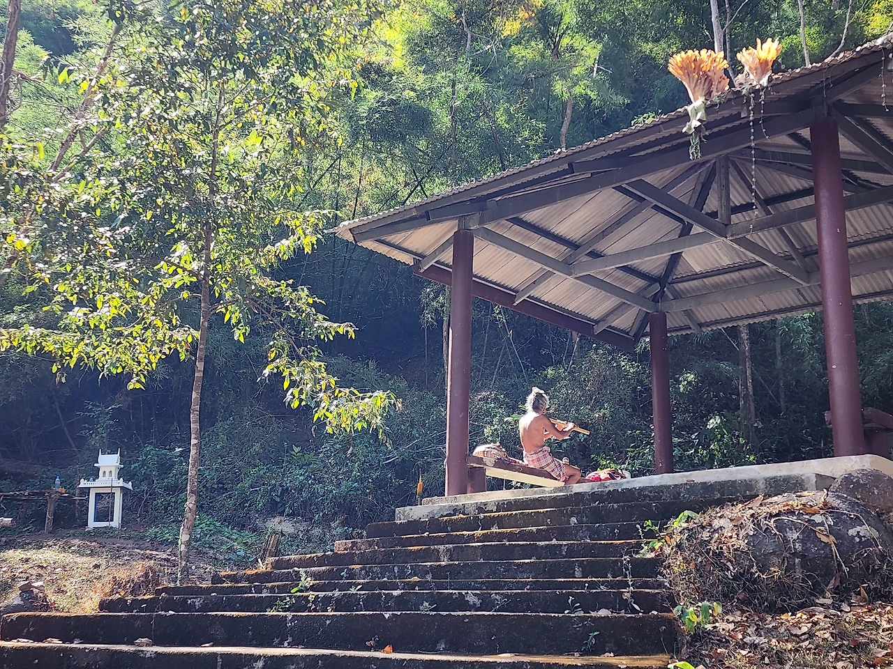 조금 일찍 서둘렀기에 시골마을 산책을 하며 약속된 투어장소로 향했다. 어젯밤 워킹스트리트에서 무슨 일이 있었는지 아무런 흔적도 없다. 쓰레기조차 없는 깨끗한 거리가 잠시 어젯밤 꿈을 꾸었듯 무색하게 기억을 잠재운다. 일일투어 관광객이 우리 부부와 이스라엘 젊은 남자분 1명이다.우리를 태운 썽태우는 시골길을 달려 온천으로 향한다. 연이은 계곡물이 모두 온천이다. 위로 올라갈수록 물의 온도가 높다. 빠이올 때 수영복을 챙겨 오지 않았기에 우리는 온천물에 발만 담글 수밖에 없었다.