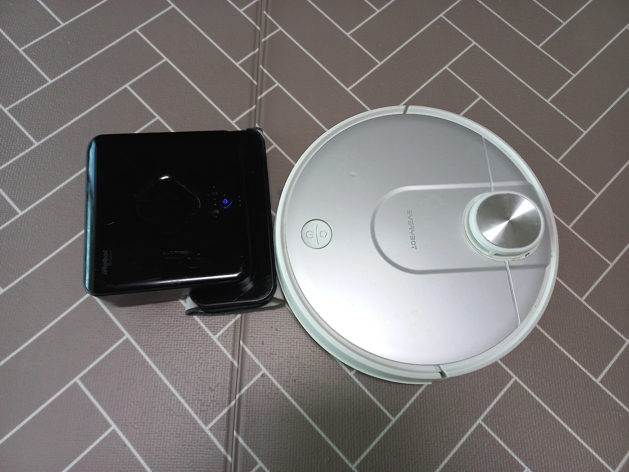 혹여 부딪침이 있을까 봐 에브리는(흰색) 방에서 부터 시작하도록 설정해 두었고, 브라바는(검은색) 거실에서 부터 시작을 하도록 명령을 해 둔 터이지만 오늘은 에브리가 침대옆 핸드폰 줄에 걸려 잠시 외도를 하는 바람에 타임이 엉켜 거실에서 충격전이 일어난 모양이다.