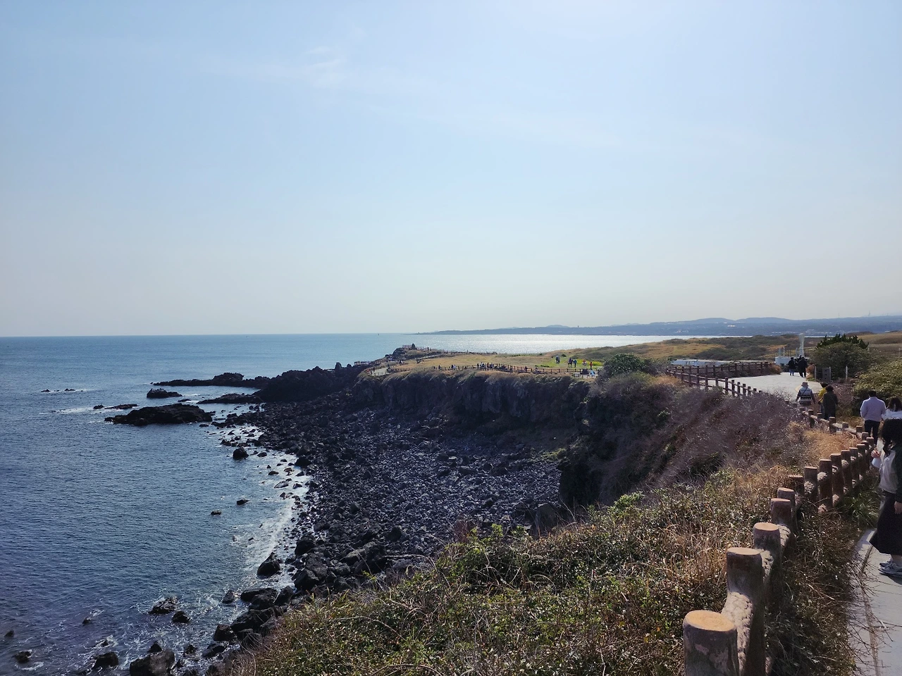 섭지코지로 갔다. 주차장이 만차인걸 보니 유명한 관광지 임에는 틀림없다. 우리는 이미 유명하다고 하는 관광지는 많이 가본 터라 알려지지 않은 볼거리를 찾아다닌다. 한가하게 여유를 부리고 싶었기 때문이다. 망망대해의 푸른 물이 끝이 보이지 않는다. 이곳에 올때마다 느끼지만 바람이 너무 세다. 그러나 바람의 언덕에 있는 유채꽃은 그 거센 바람을 막아내고 환하게 웃으며 관광객을 맞이하고 있었다. 아름다운 해안절경도 덩달아 손님맞이를 한다.