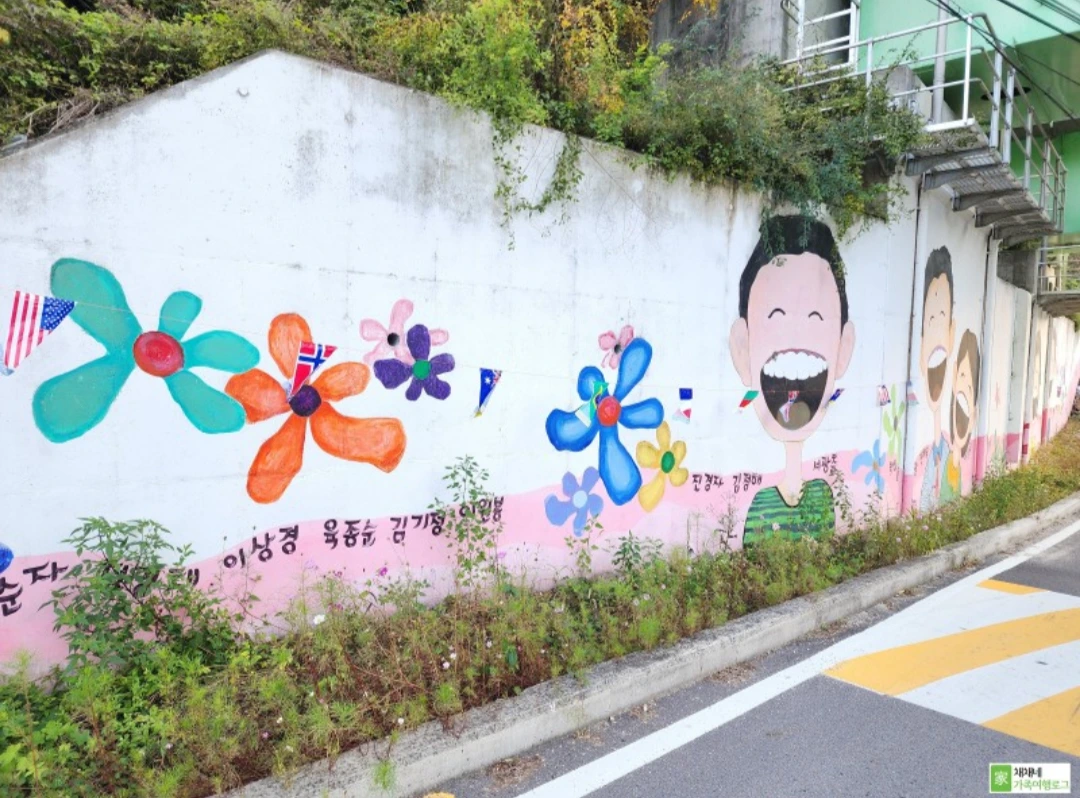 외딴 산길을 따라 한참 들어가니 익살스러운 그림과 사람들의 이름이 적힌 벽화가 마을로 들어가는 진입로를 밝혀주고 있었다. 조금 더 들어가니 가운데 저수지를 끼고 있는 아늑한 마을이 보이고 호떡을 판매한다는 플래카드가 걸려 있었다.
