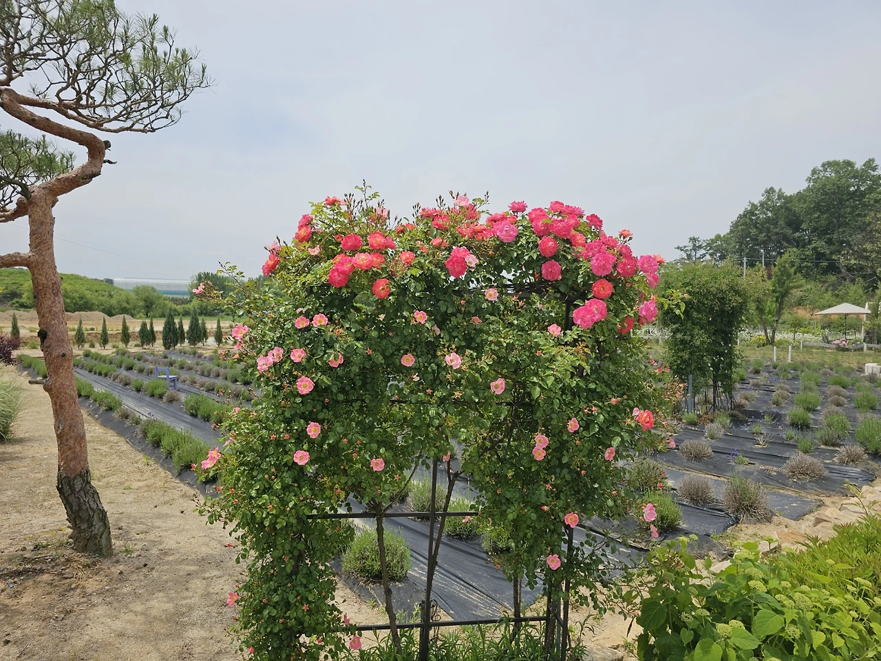 비포장도로를 지나 산길로 접어든다. 옛날 마지막 근무처가 있던 곳이라 익숙하면서도 산길로 들어서니 낯설다. 시골동네 속에 넓은 정원이 나오고 심플하면서도 예쁜 집이 한채 보인다. 1시에 예약을 하고 갔던 터라 정원을 들어서니 주인내외가 반겨 주었다. 200여 종의 꽃과 나무가 아담한 펜션과 어우러져 예쁘게 가꾸어져 있었다. 6월에는 보랏빛 라벤더가. 10월에는 빨간색 핑크뮬리가 정원을 채운다고 한다. 오늘은 장미와 사초들이 정원을 가득 메우고 있었다. 부부가 정성을 들여 가꾼 정원이다.