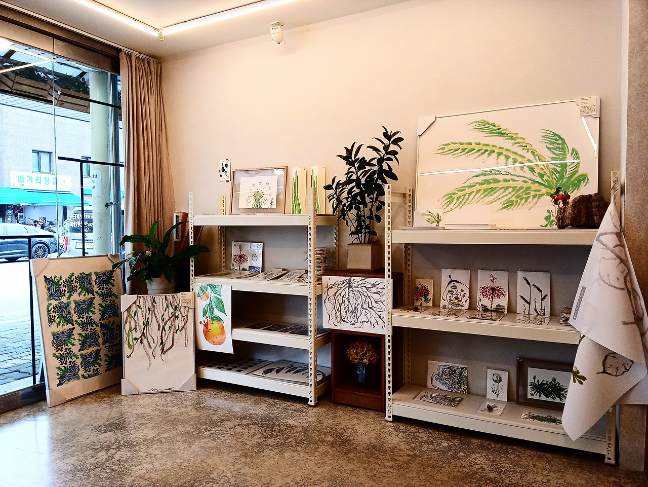 이 카페 쥔장님은 그림이 전공인 듯 화장실이 있는 위층에는 작업실이 있고 카페 곳곳에 일러스트와 회화가 진열되어 있다. 시장 건너편 청과물 가게 아드님인데 언제나 조용하고 차분하다. 초식남. 식물을 연상시키는 외모답게 카페 역시 그를 무척 닮았다.
