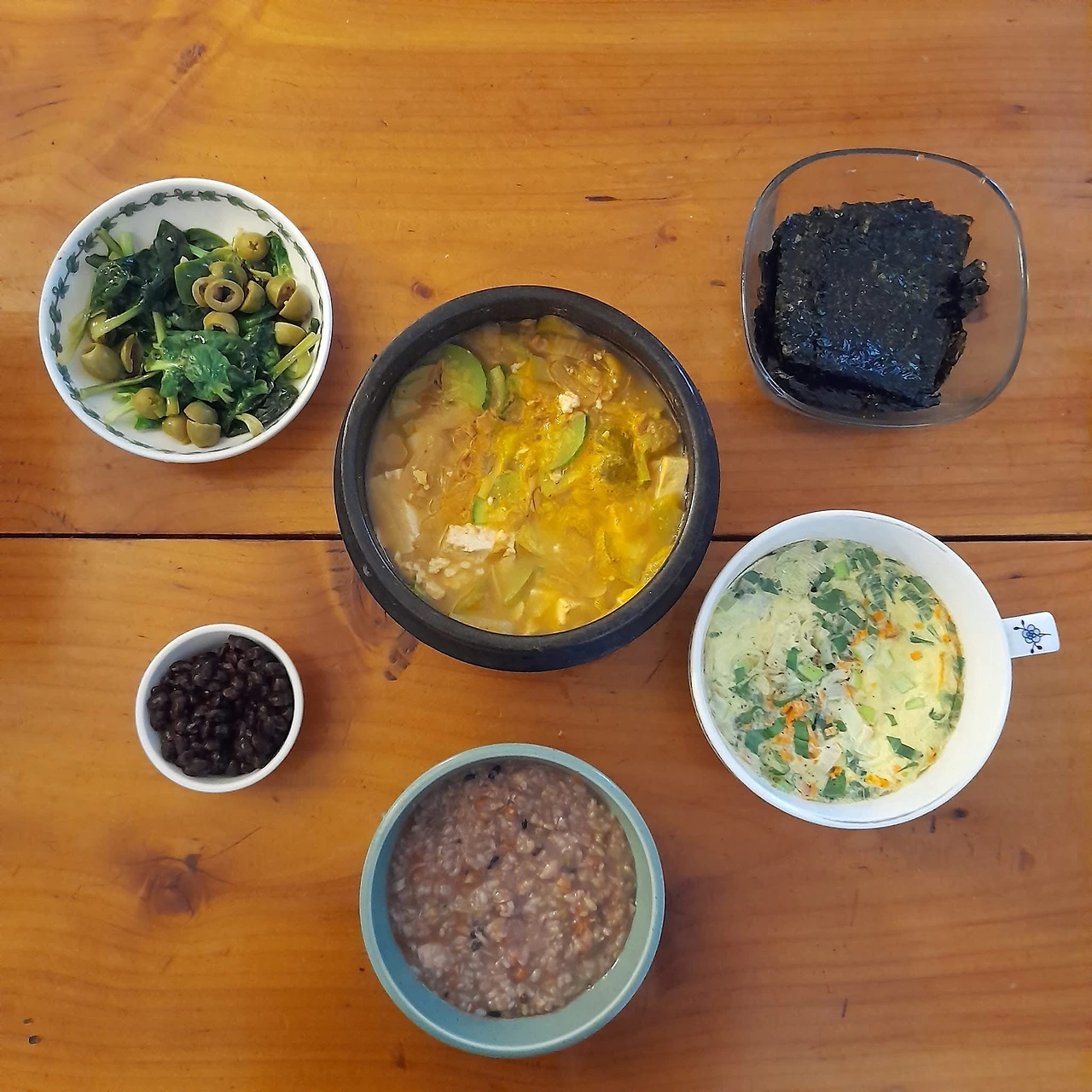 생협에서 산 유기농 우리 콩 청국장을 끓인 청국장찌개. 짜지 않아 좋다. 찹쌀 검은 쌀 귀리 조 등 잡곡으로 죽을 쑤어 호박 당근 버섯 채소 쫑쫑 썰어 넣고 참지 넣고 참치죽으로 한 끼. 또 한 끼는 카레밥으로 달리하고 달걀찜에 낫또.