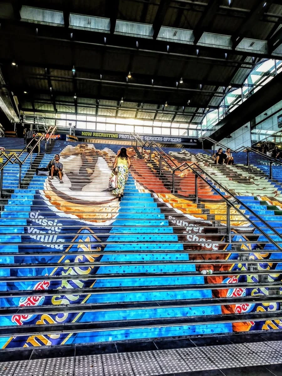 벽화를 가장한 계단그림이 보기만 해도 시원하다. 여름용 푸른 바닷물이 넘실거린다. 상품 홍보겸 자릿세 제공 시민들을 위한 눈요기.