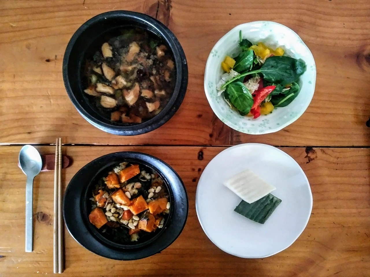 단호박 당근 취나물 영양밥과 표고버섯 된장찌개 그리고 파프리카 시금치 샐러드.