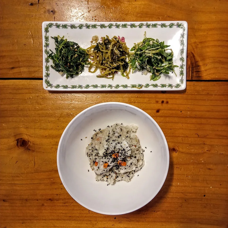 매번 죽만 먹자니 너무 심심해서 온갖 채소로 나물 밥상을 꾸린다. 밥상에서 붉은색이 모조리 사라졌다. 들기름 비빔밥으로 죽으로 밍밍해진 입맛을 돋운다. 머위 달래 방풍나물 취나물 돌나물 참나물 등등 나물의 향연. 장 보러 갈 때마다 이번엔 또 무슨 나물이 나왔나 들여다보는 게 일과가 되었다.
