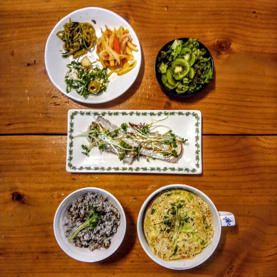 국을 끓이고 생선을 굽고 반찬을 만들고 밥상을 차리고 오늘 한 끼 일용할 양식을 먹는다.