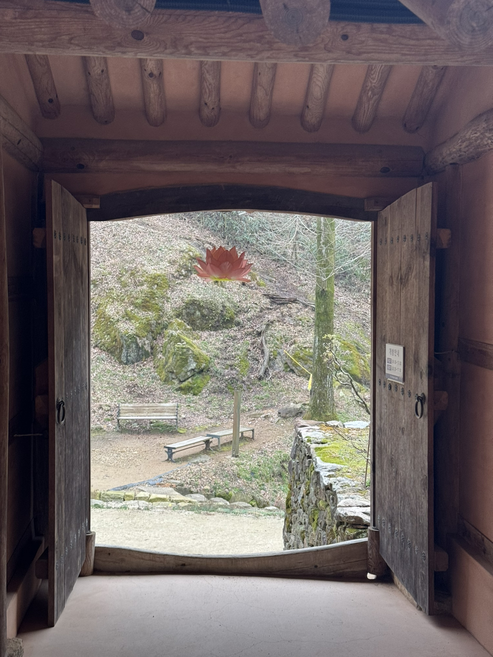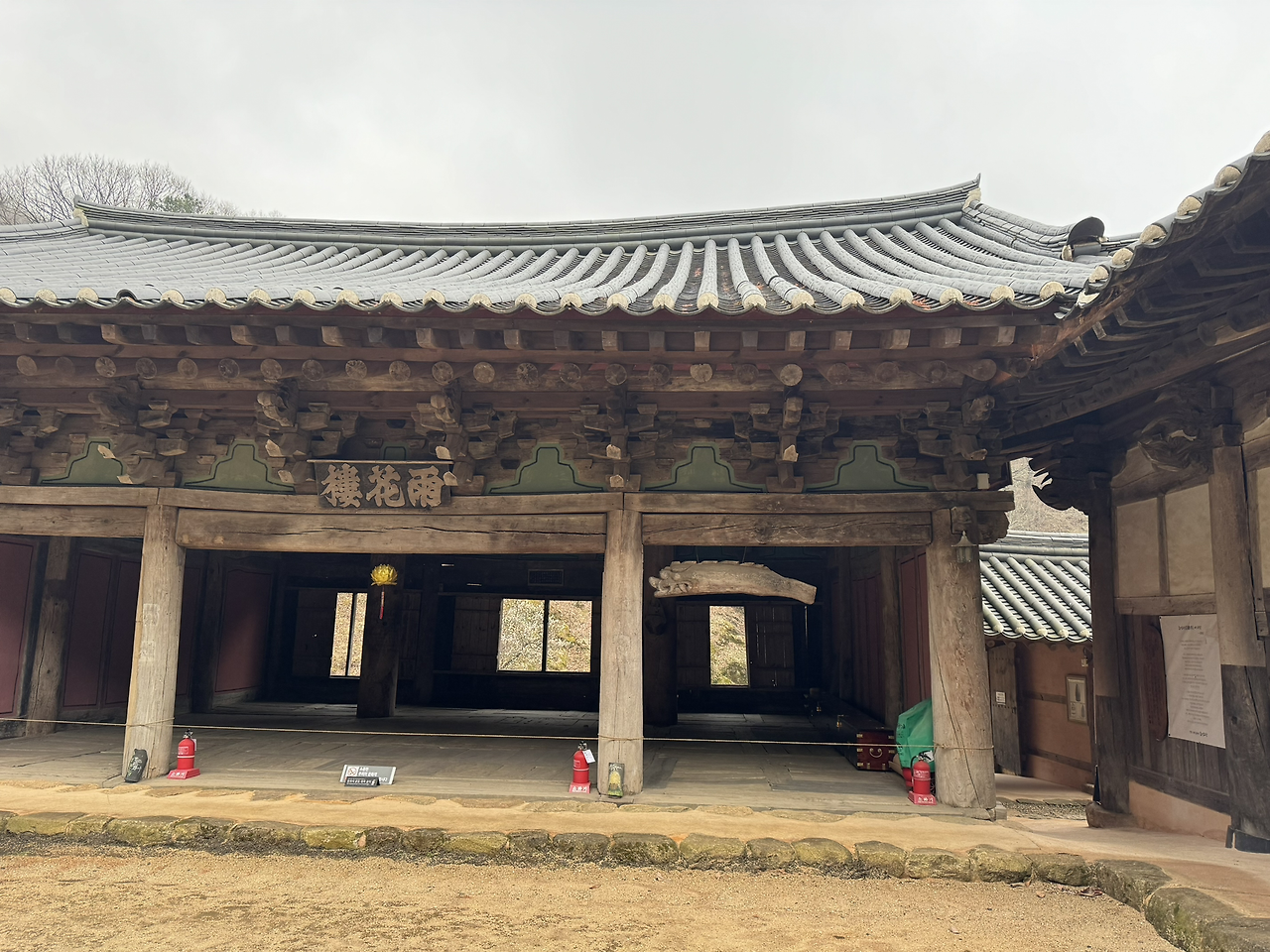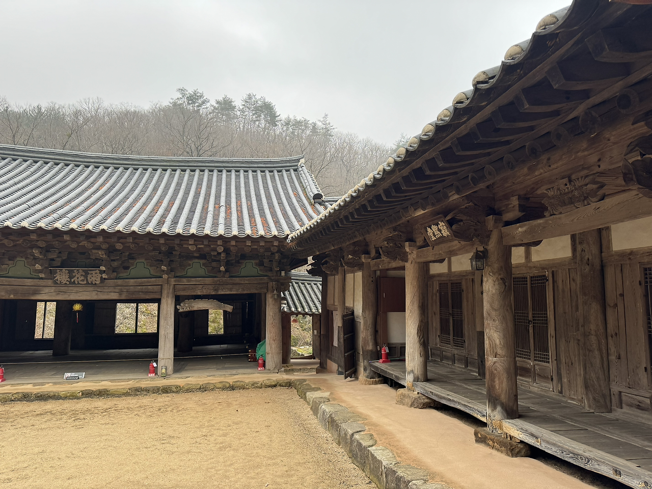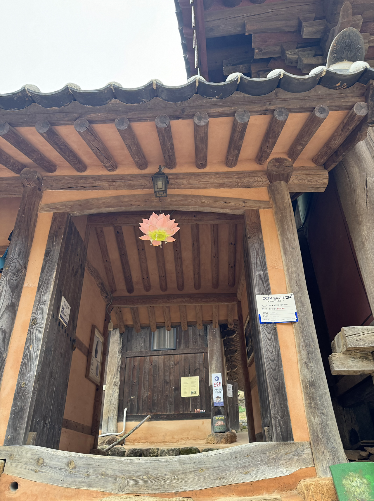 사각의 마당위 흐린 잿빛하늘이 금방이라도 또 비를 뿌릴듯 하지만 오늘은 모든게 내마음색과 하나되어 조용히 가라앉아 있다. 다시 연꽃 연등 문을 나와 경내밖 담벼락을 끼고 돌아본다. 이절엔 아직 그옛날 해우소가 그대로 남아있다. 아마 여기 분들은 저 해우소를 쓰다보다. 그 바로옆에 근대식 화장실도 있긴하지만 왠지 나도 일을 보게되면 예날식 해우소를 사용하게 될것같다. 정겹다.