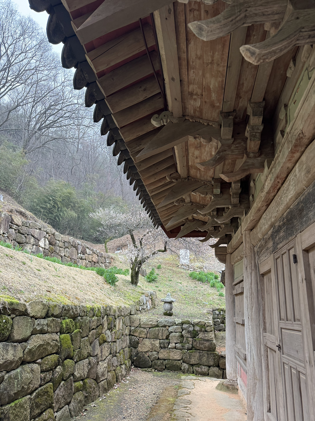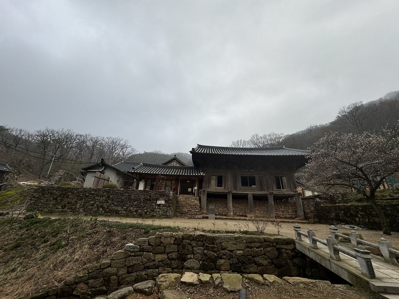 내내 이어졌던 물길의 시작점같던 계곡 다리 건너에 자그만한 부석사 무량수전같은 내소사 대웅전같은 천년의 세월이 베인 목조 기와 건축물이 보인다.