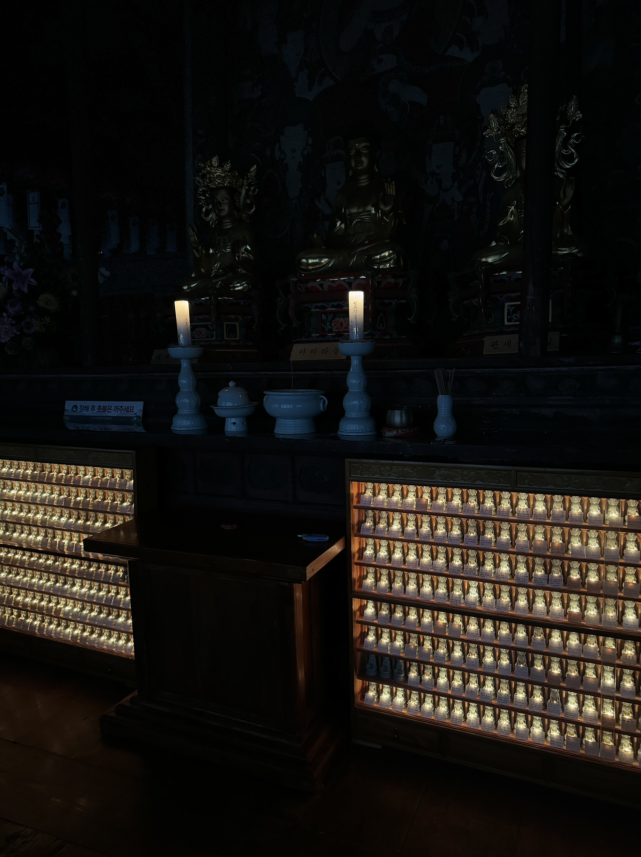 잠시 108배 올리는 두꺼운 멧방석에 앉아 절하면서 머리가 핑~돈 내 컨디션에 울적함을 확인하고 부처님께 기도아닌 바램을 기도했나보다. 향을 분향 모래에 거꾸로 박아 끈다. 양초 불도 재단에 놓인 놋쇠 주걱으로 눌러 끈다. 까만 법당에 촛불의 잔영이 하얗게 연기되어 사라진다.