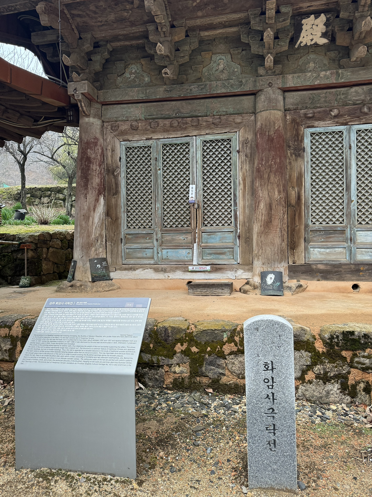대웅전이 굳게 닫혀 들어가도 되나 싶지만 걸고리로 열수있게 잠긴 문고리를 열고 컴컴한 법당에 들어선다. 향 하나올리고 양초 두개에 어렵사리 불을 붙이고 천년나무냄새가 은은한 싸늘한 법당에서 목례하고 합장하고 한동안 서 본다. 뭘 생각하며 삼배할까? 아마 삼십이전에 년전에 받은 “평생 명심문”이 떠오른다. 운명인가보다. 그냥 저절로 그 명심문을 읊조리며 삼배. 또 부처님 불상 세개만 가녀린 촛불속에 윤곽드러내는 그곳 응시하며 생각해본다. 부처님께 기복을 바라는 기도는 하지말라 했는데 .. 다짐을 다지는게 나은데.. 한번만 삼배하고 가기에 너무 아쉬운 화암사 대웅전. 다시 삼배한다.
