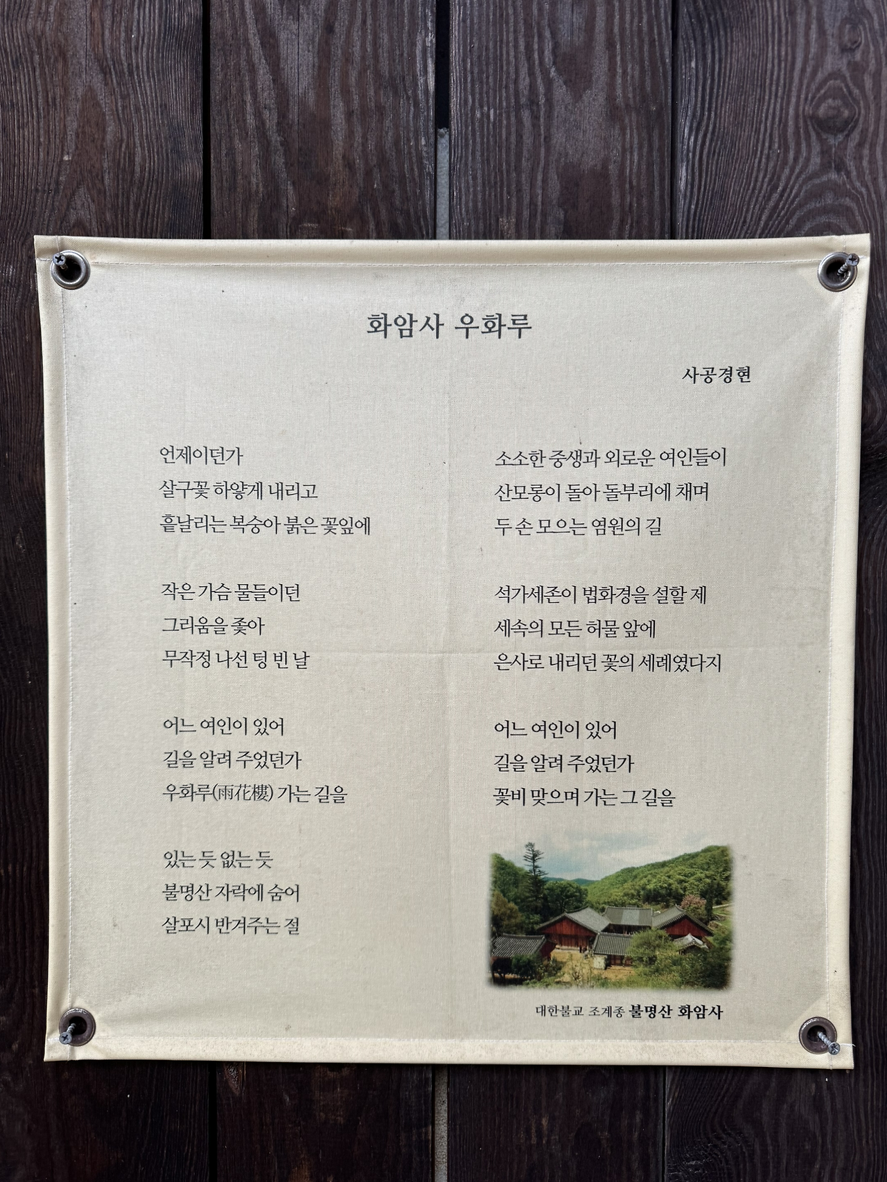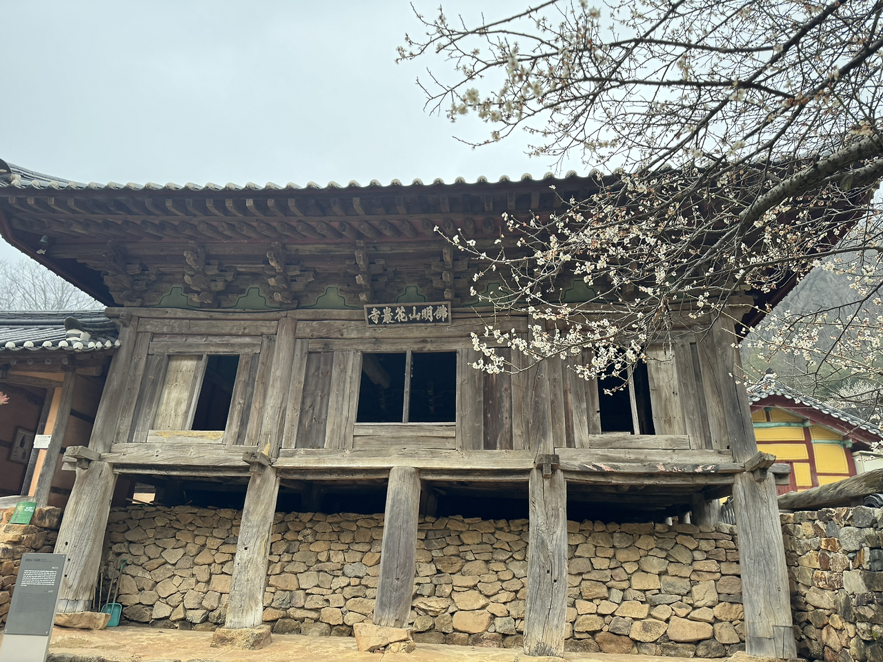 “불명산 화암사” 현판이 사천왕상같은 필체다. 산벚꽃 한그루와 온통 이끼 돌담에 올라선 수수한 목조 건물 몇채. 아무도 없다. 오는길 내내 그랬다. 목조 건물 네동이 우화루와 대웅전을 마주하며 입구字 형태로 자리잡은 경내.