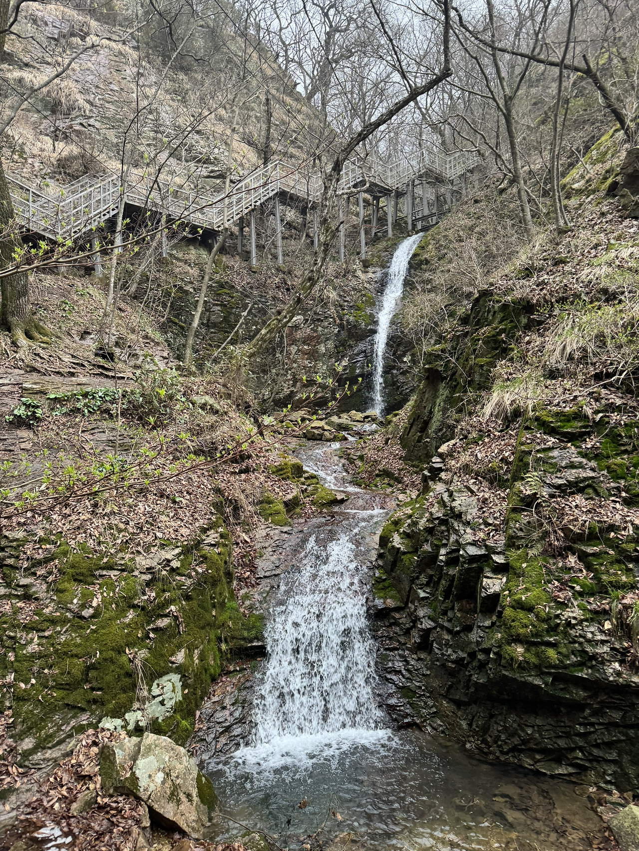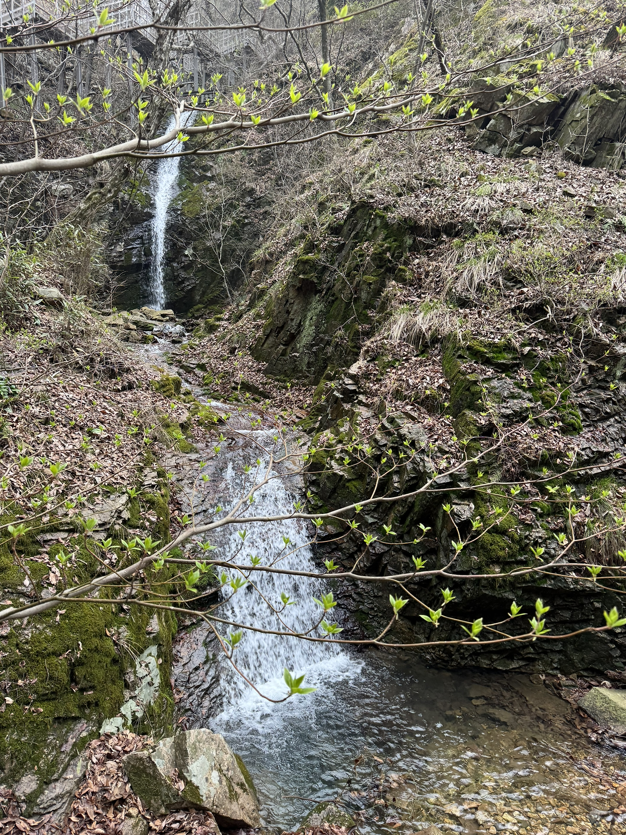 참좋다. 얼레지라는 할미꽃같은 꽃이 귀여운 벌레같이 좋고 귀를 관통해 머리까지 들어가 잡념까지 씻어주는 물소리가 좋고 백일애기 궁둥이같은 새순들이 삐죽삐죽 좋고 오르는 내내 다른 모습들로 다가온다. 긴 2단 폭포를 비스듬히 가로지르며 급경사 철계단이 나오는 걸보니 어느새 다달아 가나보다. 화암사 가는길.