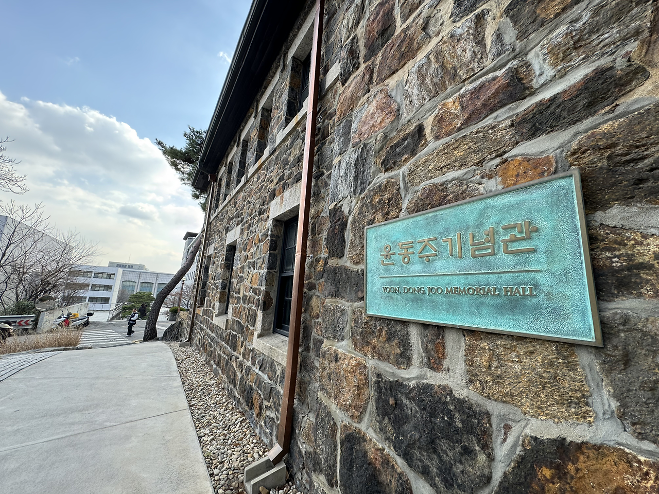 주인인척 걷다가 걷다가 윤동주 문학관에 다달았다. 일제시대 창문같은 문입구에 보존차 예약입장만 허용한다는 안내문구조차도 정겹다. 바깥차경이 반사되어 흐릿하고 어두운 안쪽에 윤동주가 사각모에 검은 망또 교복입고 책상에 걸터앉아 있는 모습이 보인다. 좋다 정겹다.