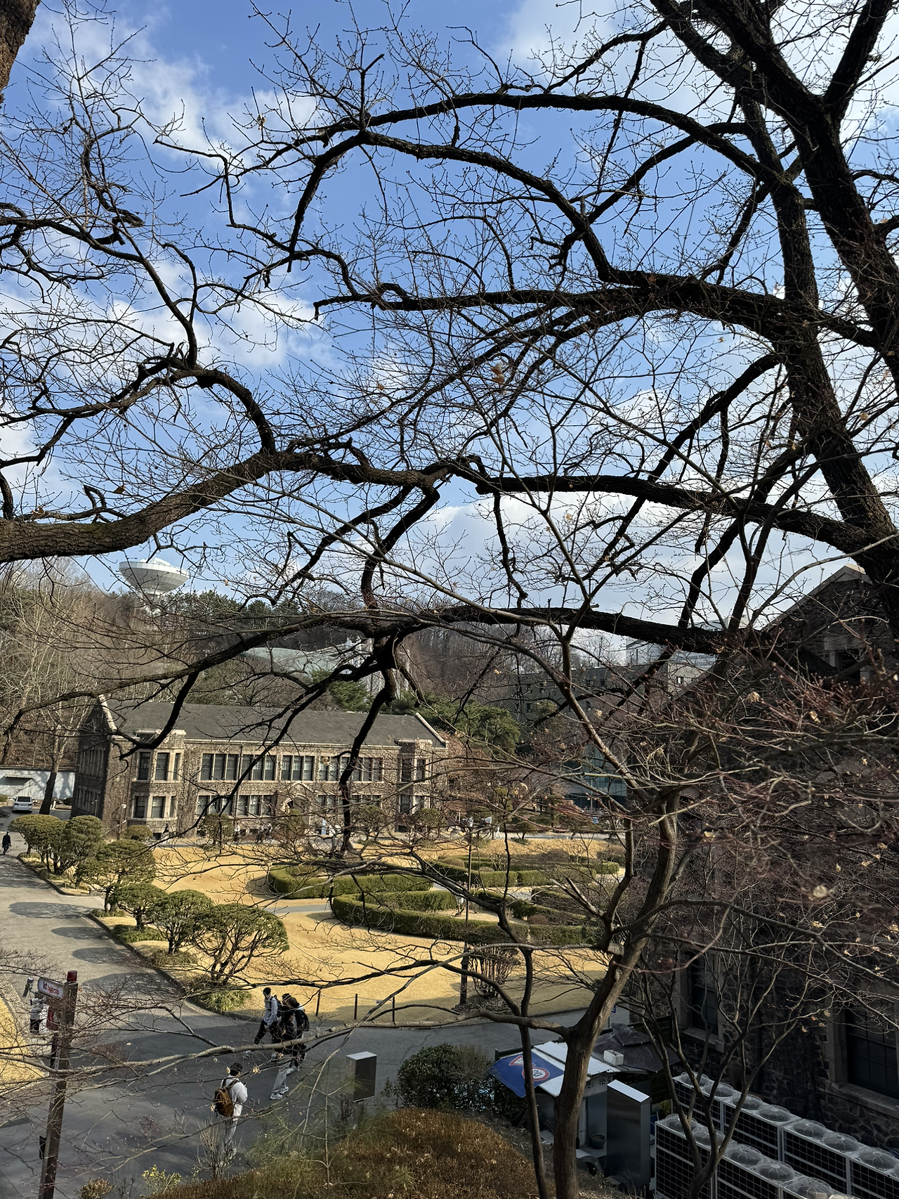광혜원 담벼락을 벗어나 뻥뚫린 세종로 같은 연대 메인 로드를 접어든 순간 몽련 망울, 개나리 멍울. 이름모를 화초나 나무들 새순 막 터져나오려고 맺친 겨울눈들. 그리고 싱그러운 누런잔디… 진짜 누런 잔디가 싱그럽다. 한여름 초록 잔디보다 옛날 국민학교앞에서 팔던 병아리들 누런 솜털같이 어쩜 그리 싱그러운지..오늘 처음 느꼈다.