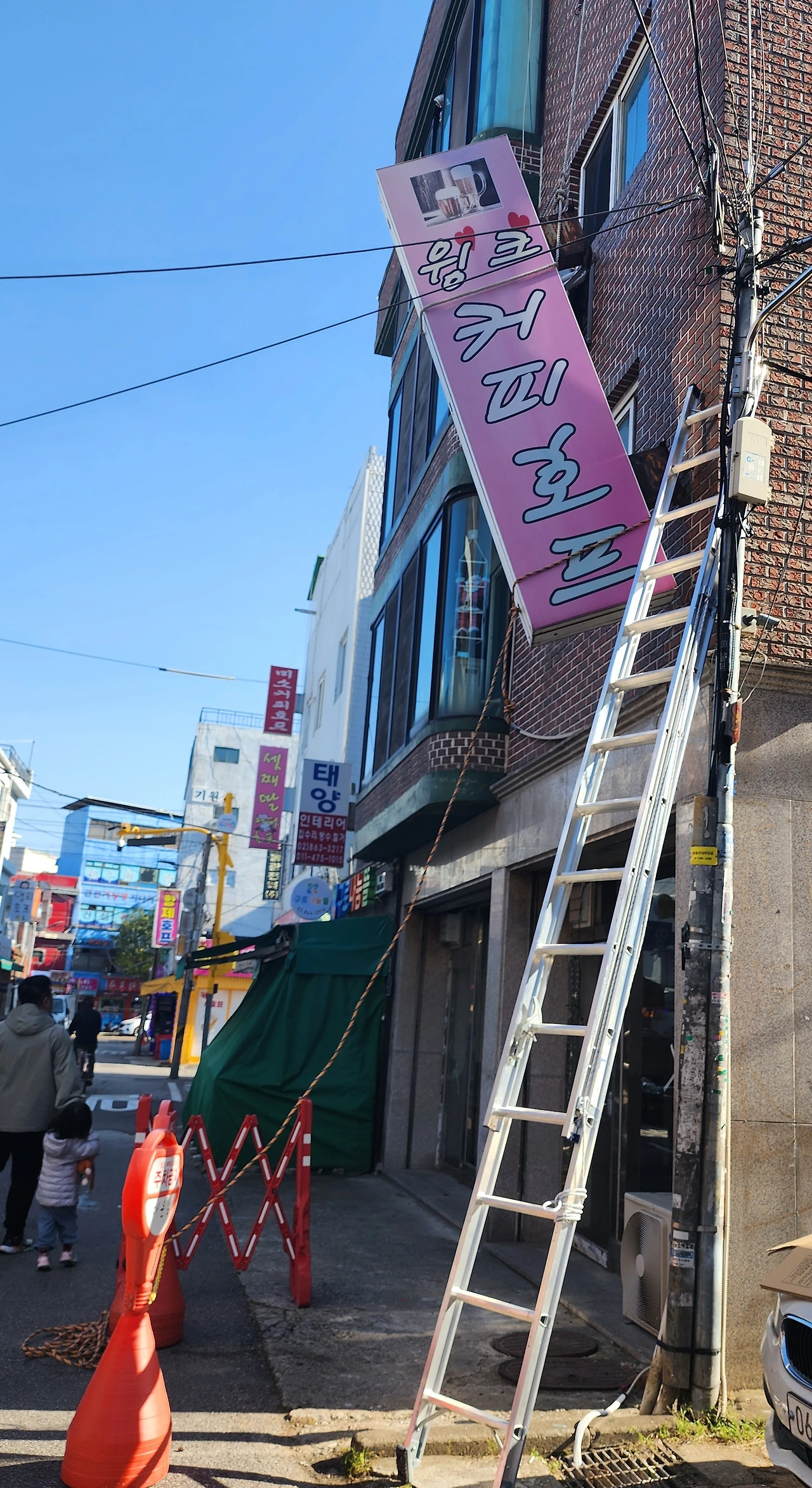 오후 12시, 친구 집에서 나섰다. 화창한 날씨 11월의 하늘은 금방 세수한 것 같다. 바람이 약하게 분다. 춥지도 덥지도 않은 이런 날씨가 좋다. 주택가 골목에서 버스가 다니는 큰길까지는 약 300m, 경사가 완만한 내리막길이다. 큰길에 다다를 즘, 3층짜리 빨간색 벽돌 건물에 접이식 알루미늄 사다리를 2층까지 닿게 길게 뽑아 설치해 놓았다. 60cm 폭에 길이가 약 2m 되는 돌출형 간판이 철거 중이다. 바닥에는 바리케이드를 설치해 놓았다. 일하는 사람은 한 사람뿐인데, 연세가 70대나 80대는 돼 보이는 노인이다. 챙이 달린 모자를 썼는데, 흰머리가 성성하다. 간판 철거 작업이 이미 어느 정도 진행되고 있었다. 건물벽에 간판을 붙잡고 있던 앵커 볼트가 완전히 분리되어 옥상에서 고정된 밧줄에 간판 윗부분이 묶인 채로 곡예하듯이 대롱대롱 매달려 있다.