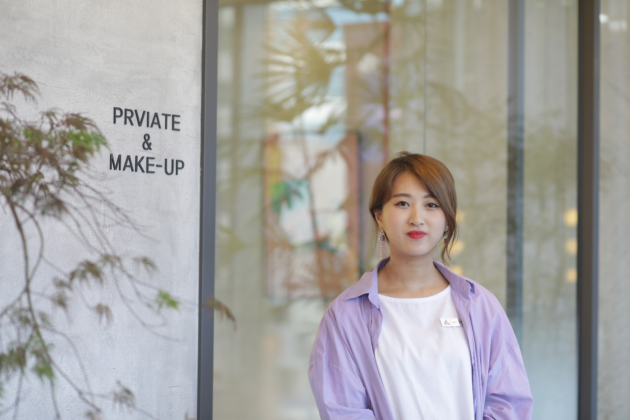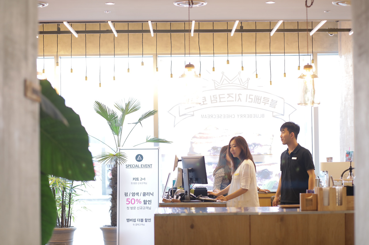 예술적 기품이 느껴지는 헤어살롱 입구 데스크에 미모의 매니저가 있다.